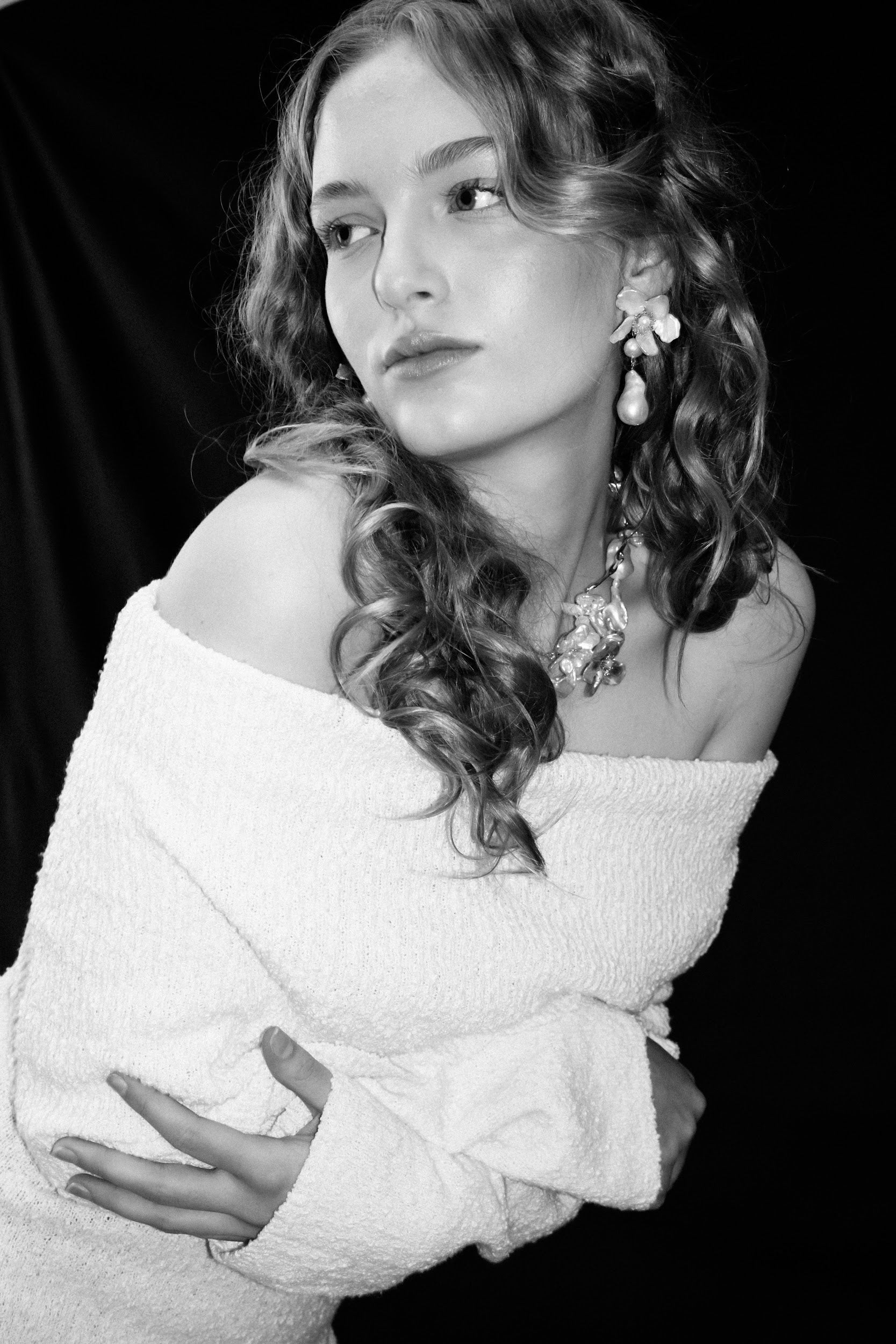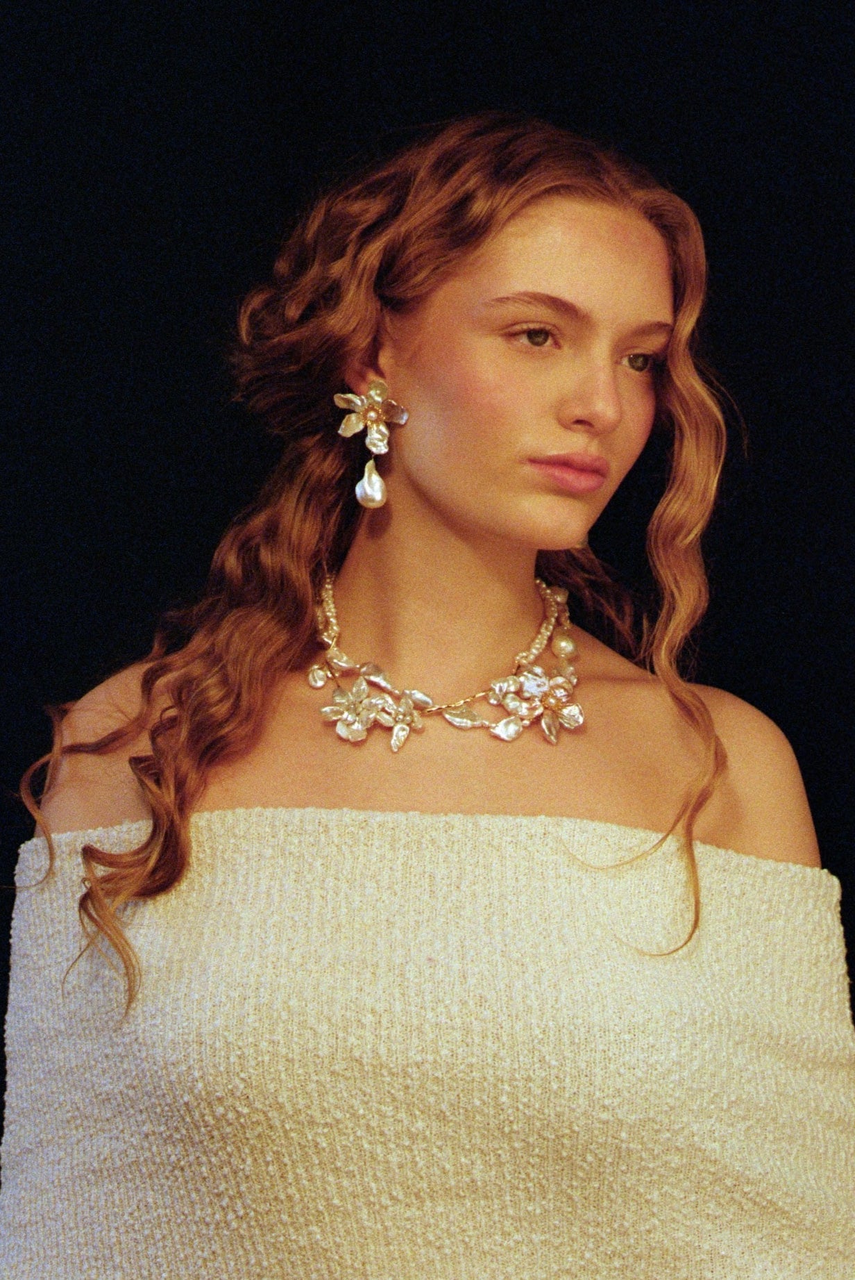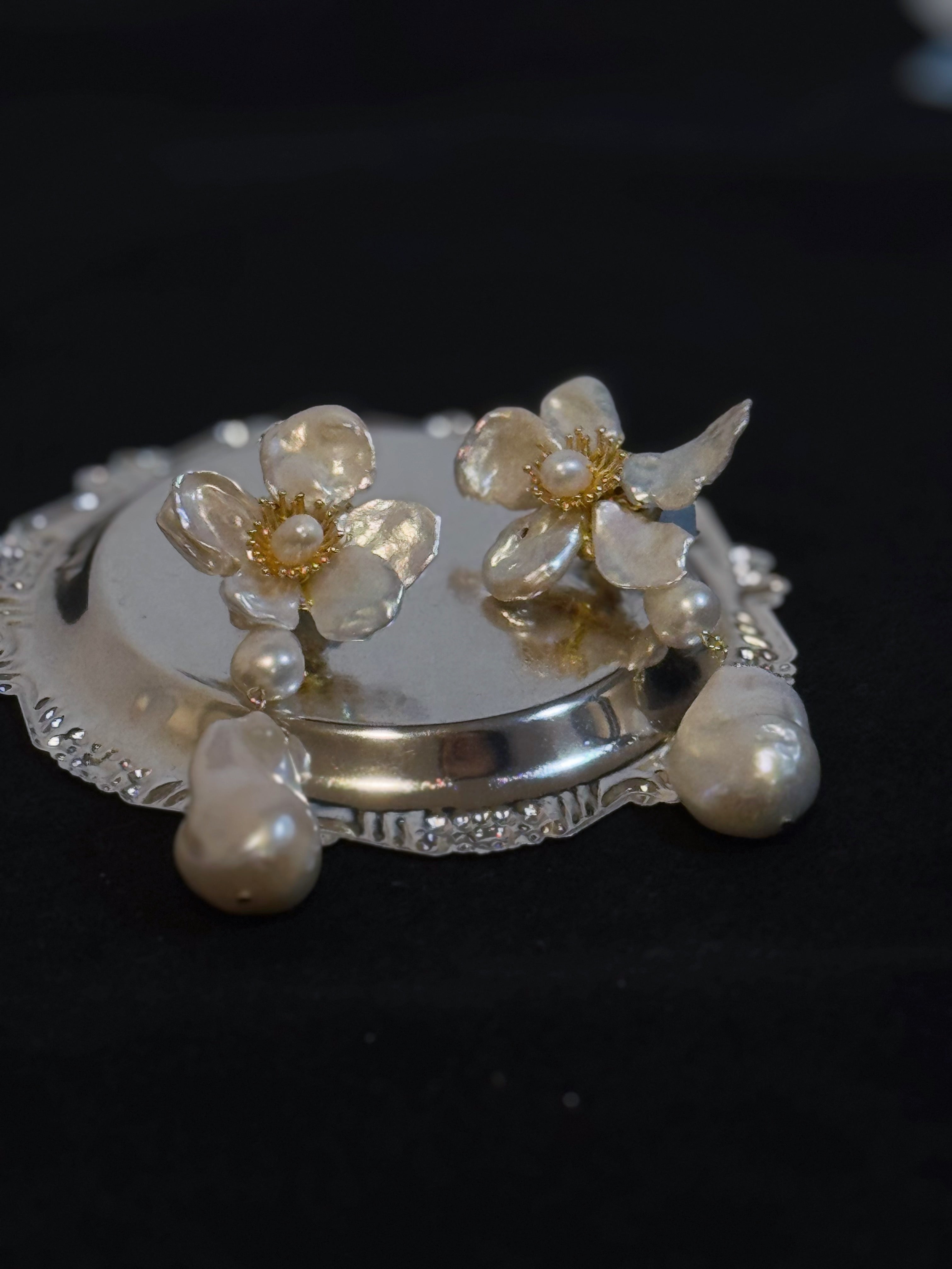 These earrings feature delicate keshi pearl flowers paired with stunning baroque pearls, each radiating a soft metallic glow with subtle pink undertones. The organic shapes of the baroque pearls add uniqueness to every piece, while the luminous petals of the pearl flowers evoke timeless sophistication. Each piece of our jewellery is handcrafted in Norwich.