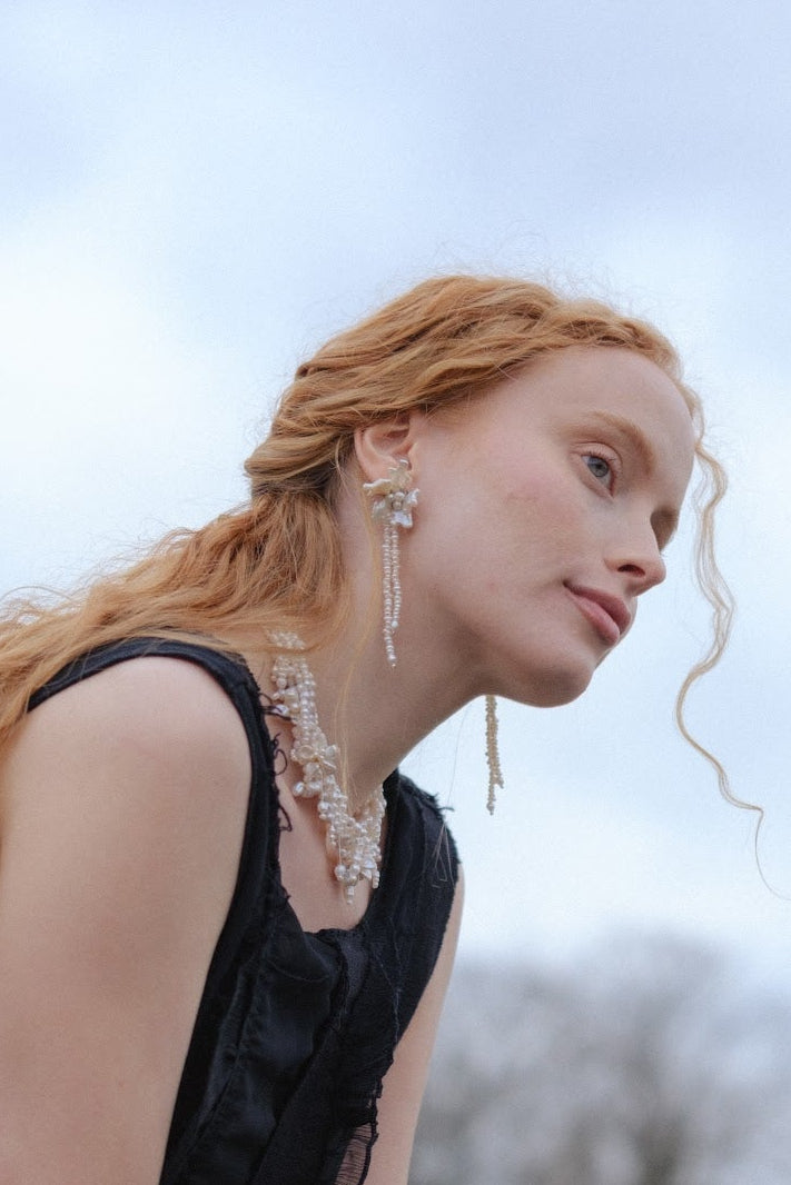 White pearl beaded drop earrings with flower stud. Each piece is handcrafted in Norwich.