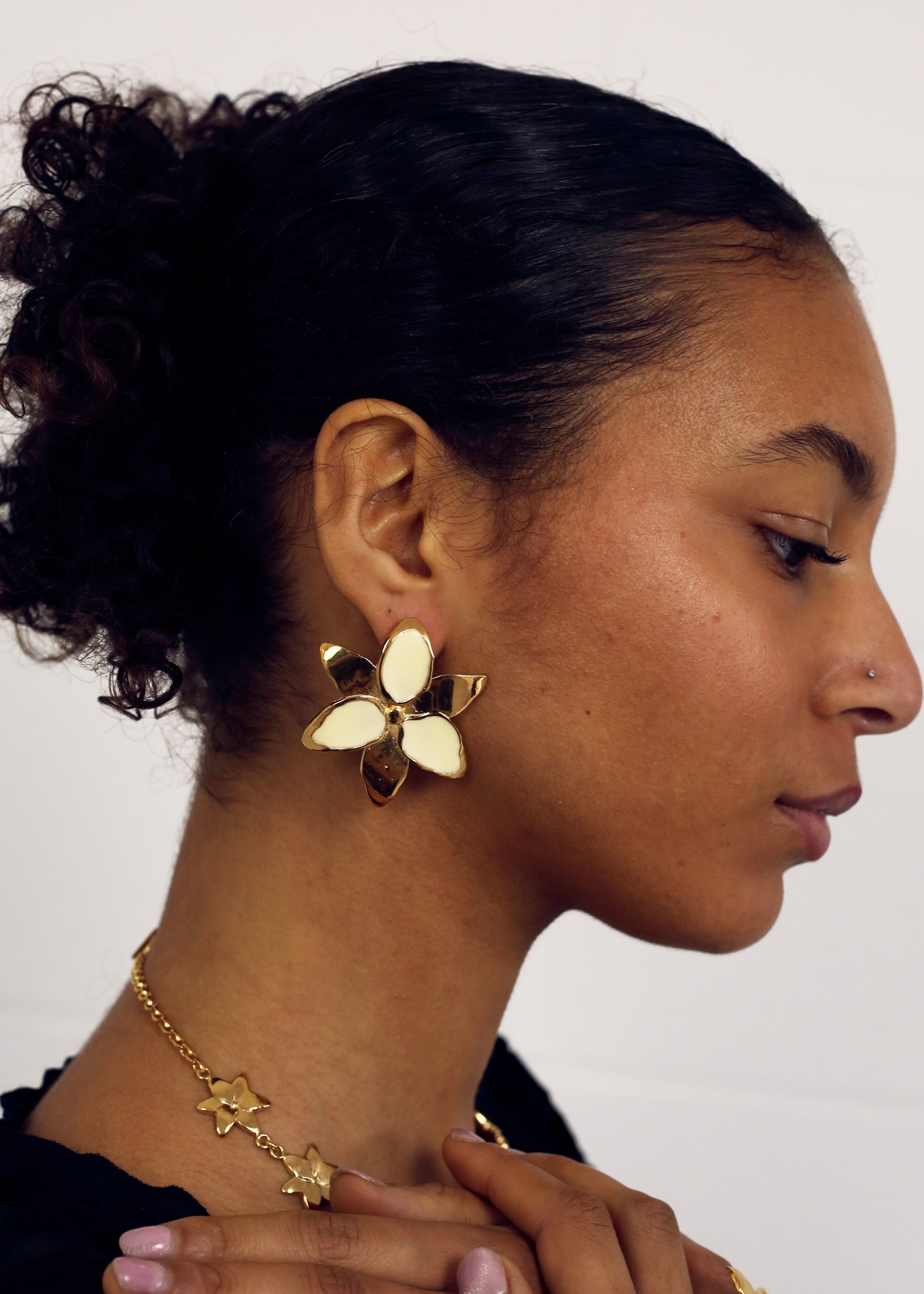 The Cocktail Twins are oversized flower shaped statement earrings in gorgeous cream french vanilla enamel and gold vermeil. Named after the Double Asiatic Lily. The perfect statement earring for radiating an ethereal charm.