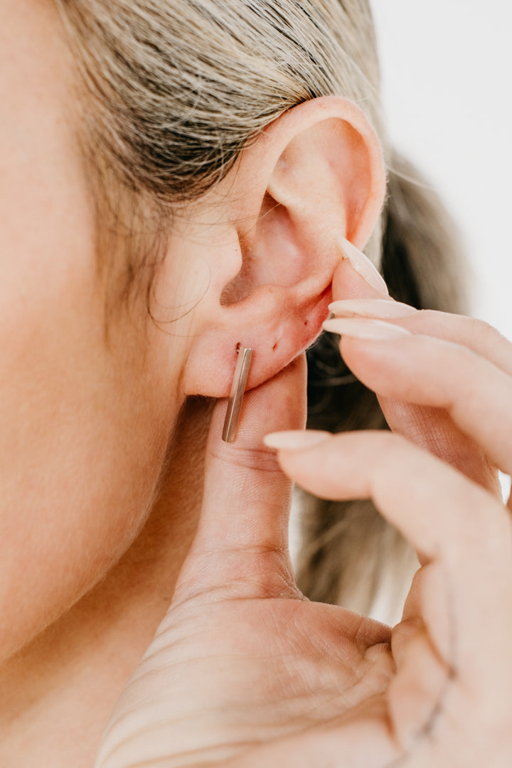 The Crux midi earrings have an elegant structural aesthetic, perfect for everyday wear. Layer up with Crux mini earrings + ear cuff.