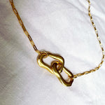 A solid silver raindrop chain with a linked shape made from two classic curve hoops suspended in the centre. This piece was designed as the sister to the Classic Curve Studs. Playing on the eternity motif, the links are hooped through each other but move individually. The beautiful chain is an unusual raindrop style and layers well with other longer pieces.