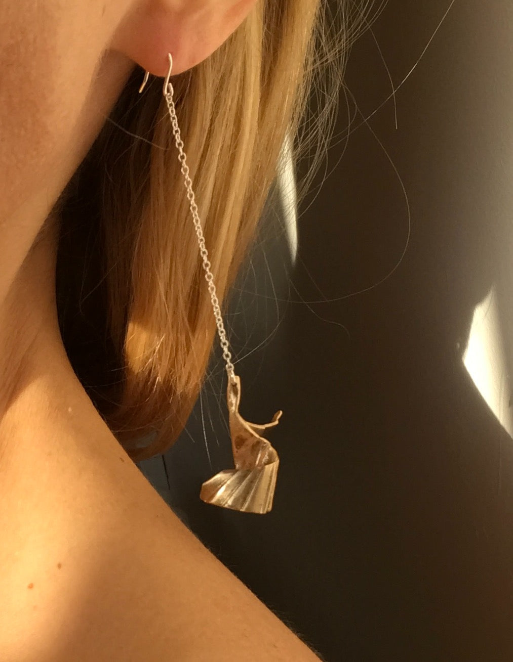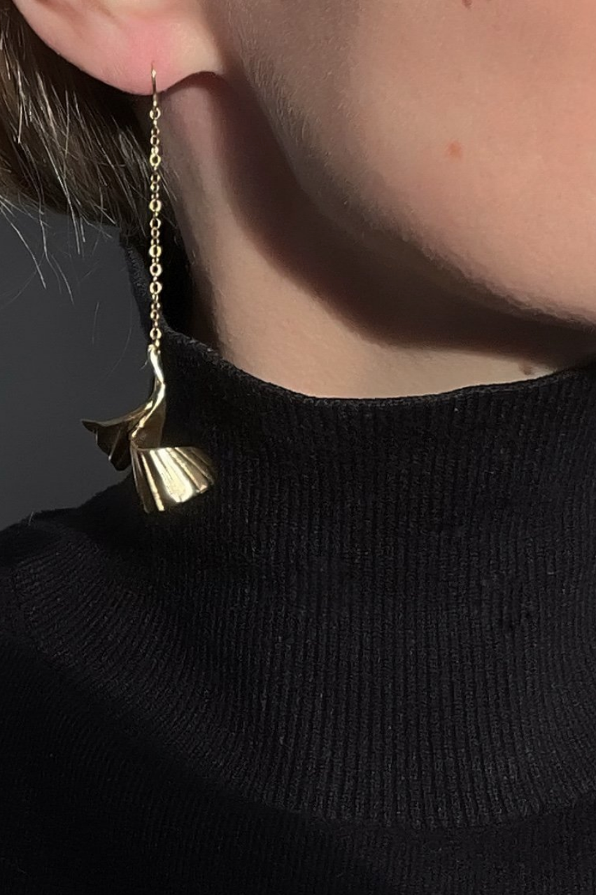These hand carved flower-inspired earrings resemble delicate petals strung from a super lightweight chain. A beautiful dangle, standout earring choice for parties or weddings.