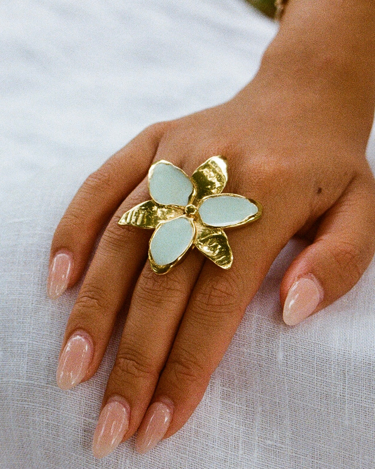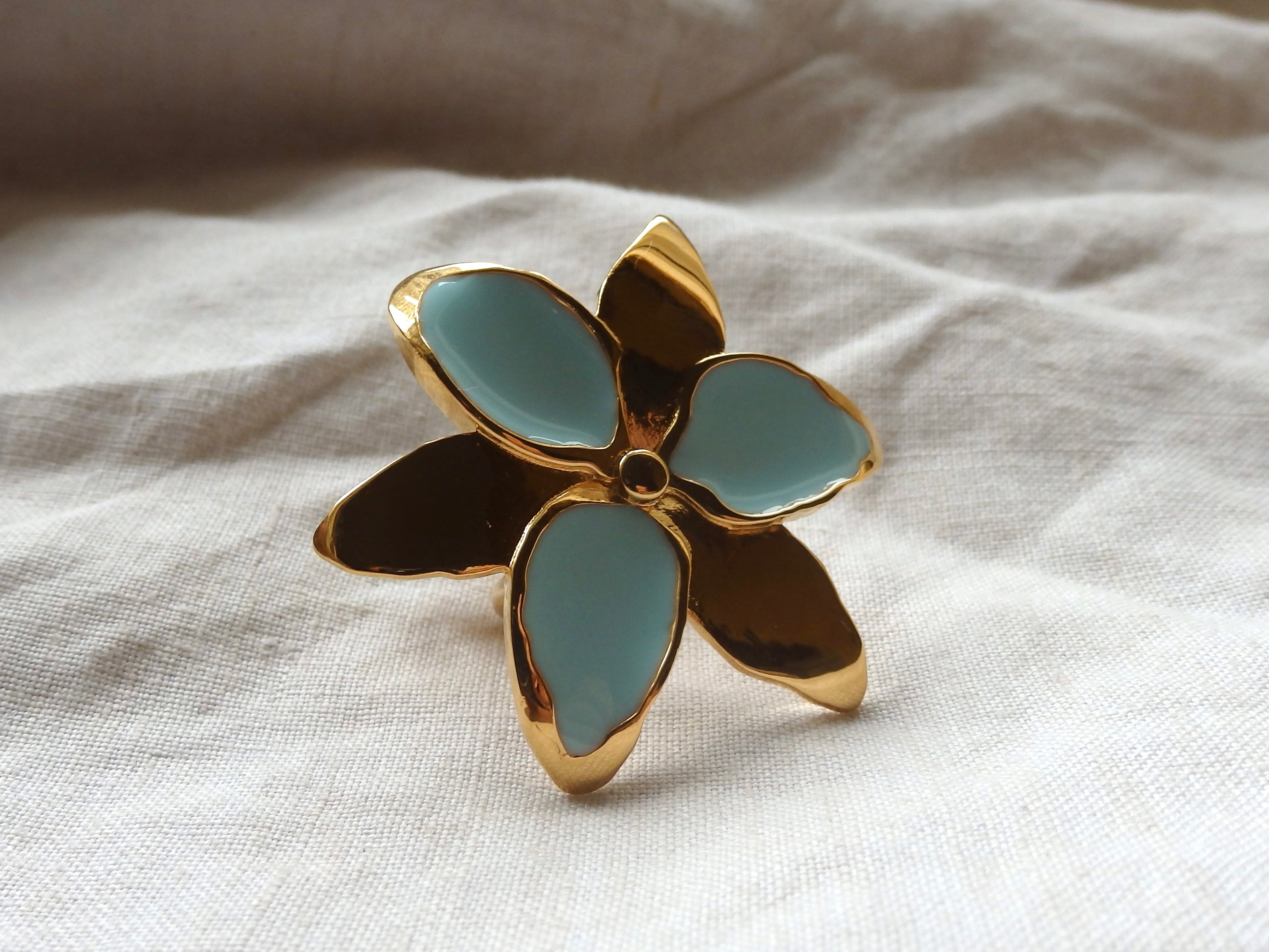 The Little Kiss is a gorgeous oversized statement flower ring in sky blue & gold. Named after the Asiatic Hybrid Lily. The perfect cocktail ring.