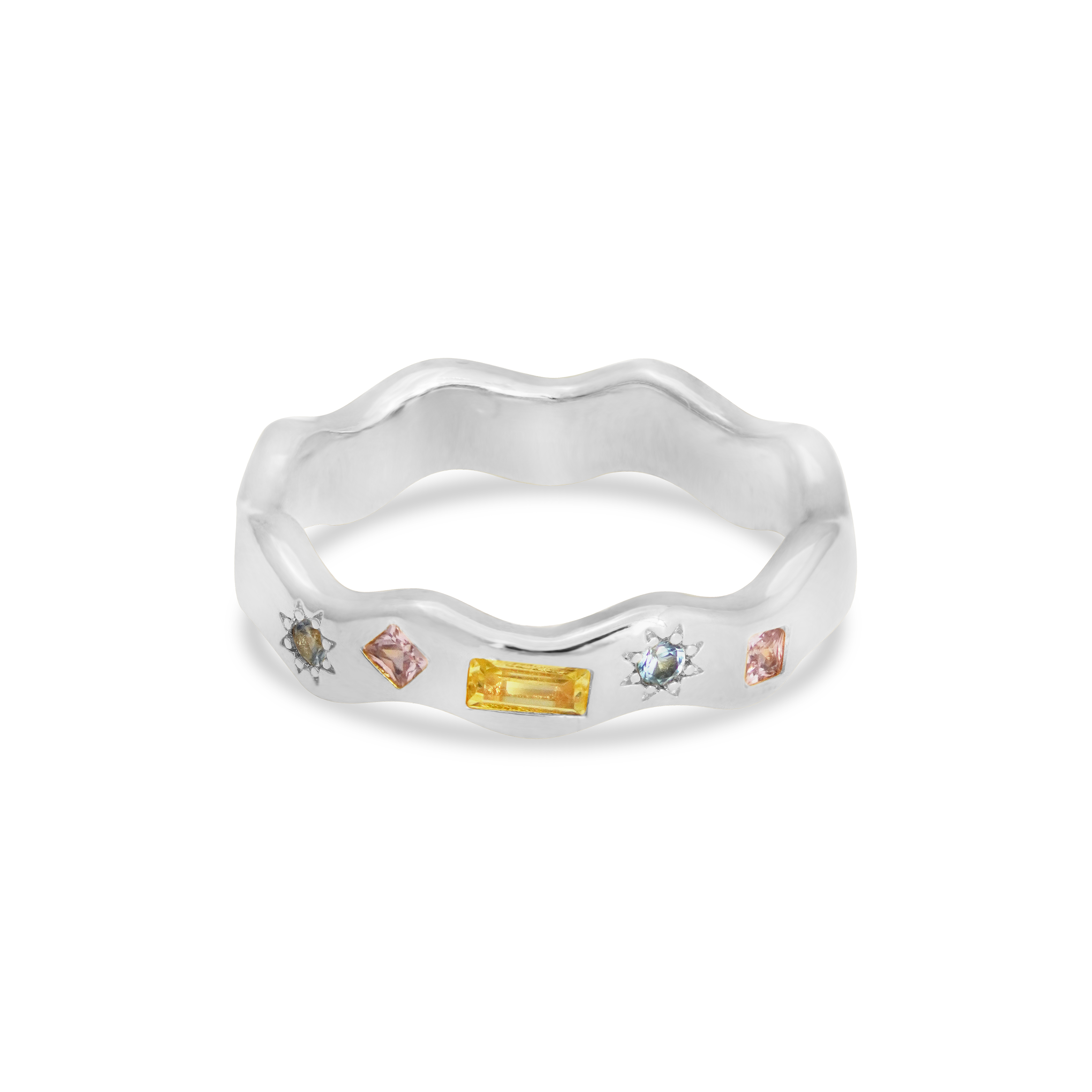 Get ready to wiggle. The unique fluid shaped band makes it instantly noticeable, ideal if you’re on the lookout for something a little different. The array of pastel coloured gemstones makes the final flourish on this playful style. Add this piece to your collection for a little added fun!