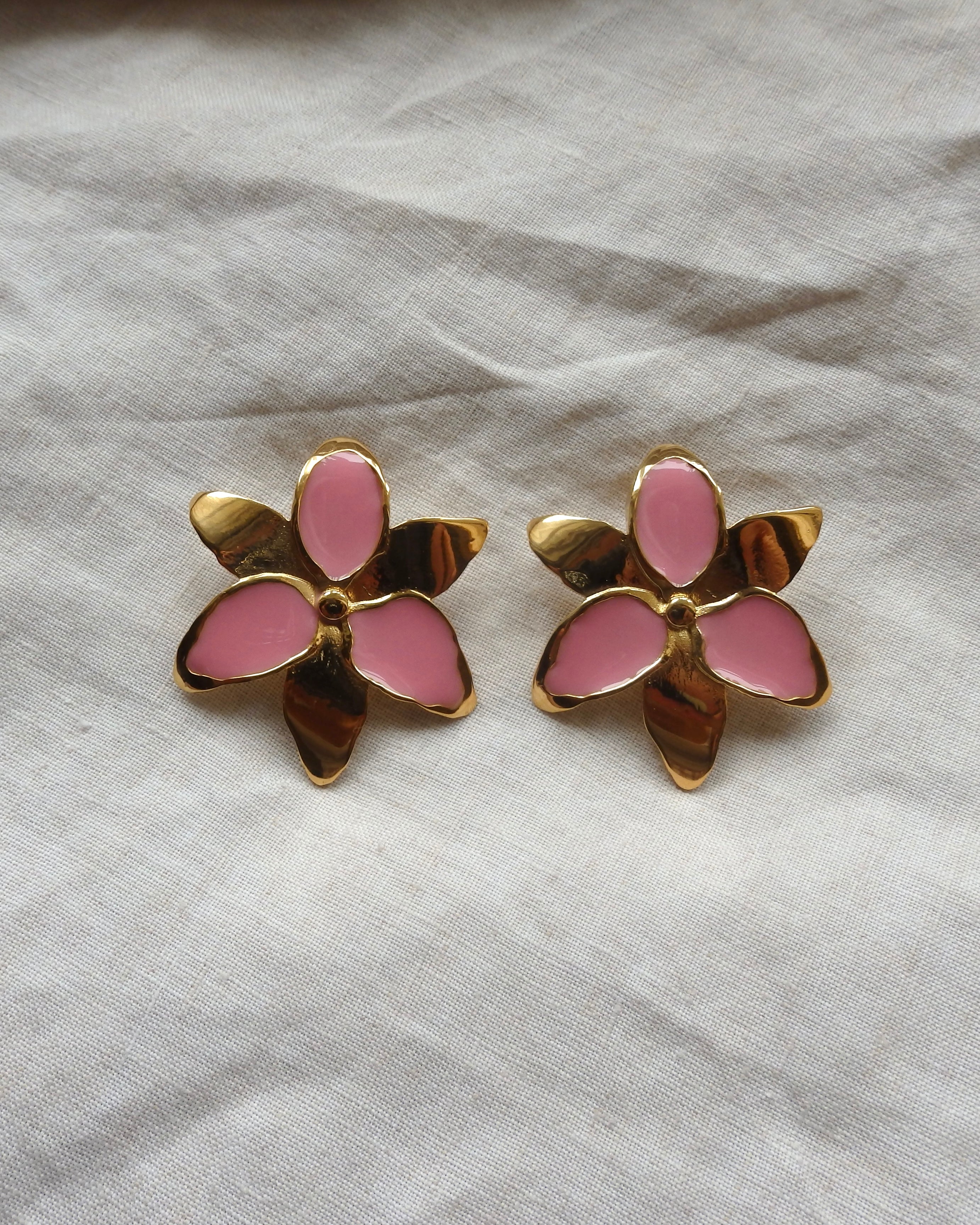 Squeeze-London-Pink-Gold-Enamel-Oversized-Statement-Flower-Lily-Earrings-Cocktail-Twins