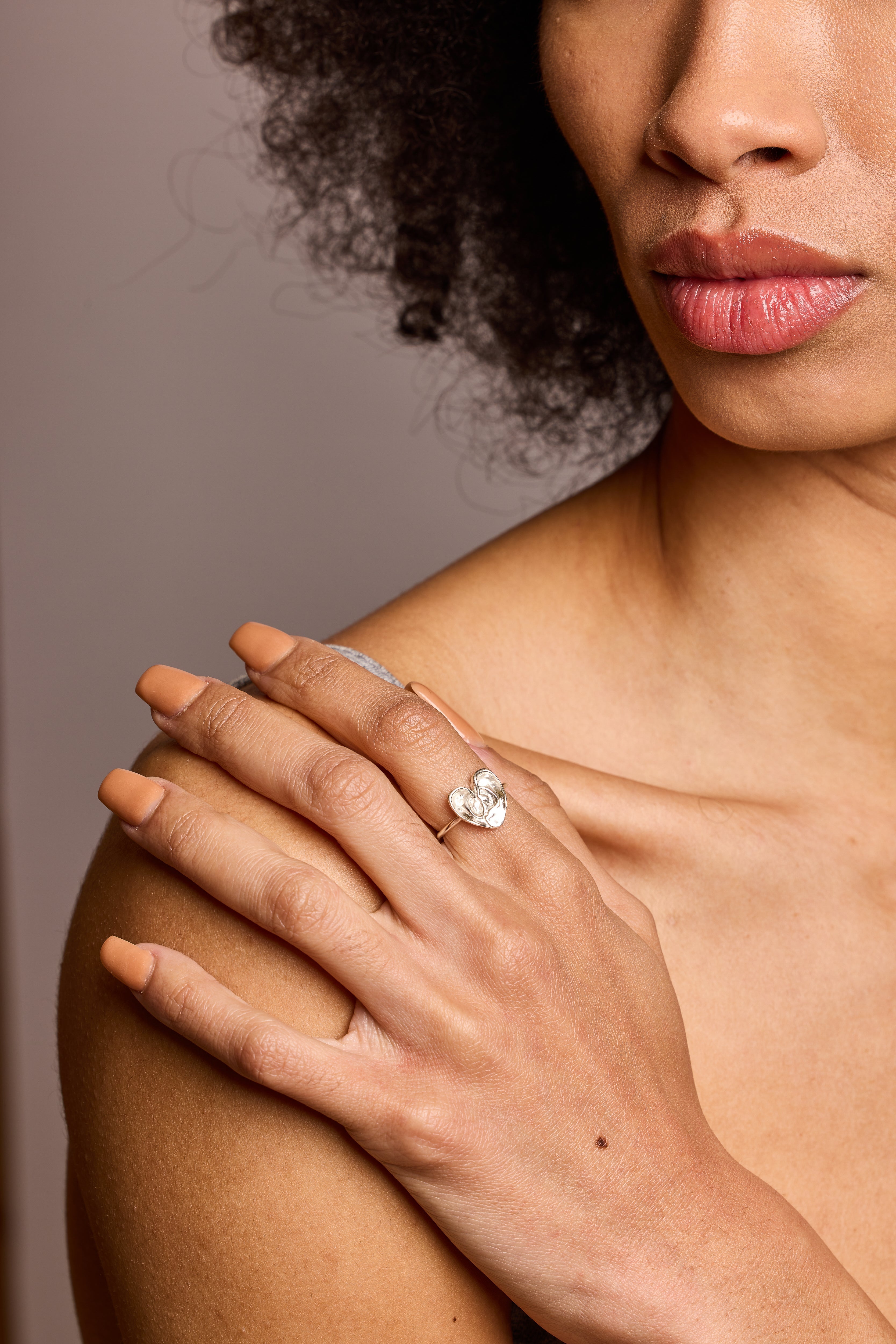 This handmade, dainty ring has a motif of two ears making a heart, to represent the power of good listening.