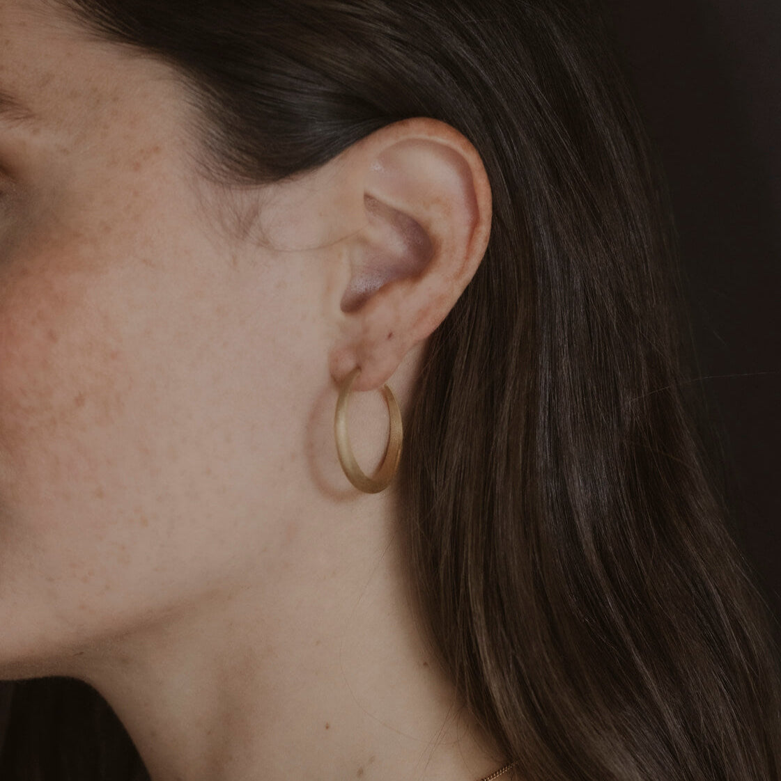 The tapered silhouette of these earrings gives a sculptural edge, while the soft brushed texture catches the light beautifully, a detail that makes these hoops feel quietly luxurious and endlessly wearable. Lightweight and comfortable, they’re designed for everyday confidence, yet bold enough to take you effortlessly from desk to dinner. Whether styled solo or layered with studs and huggies, these hoops are the versatile investment piece your jewellery collection has been waiting for. Push-back earring post with butterfly fastening.