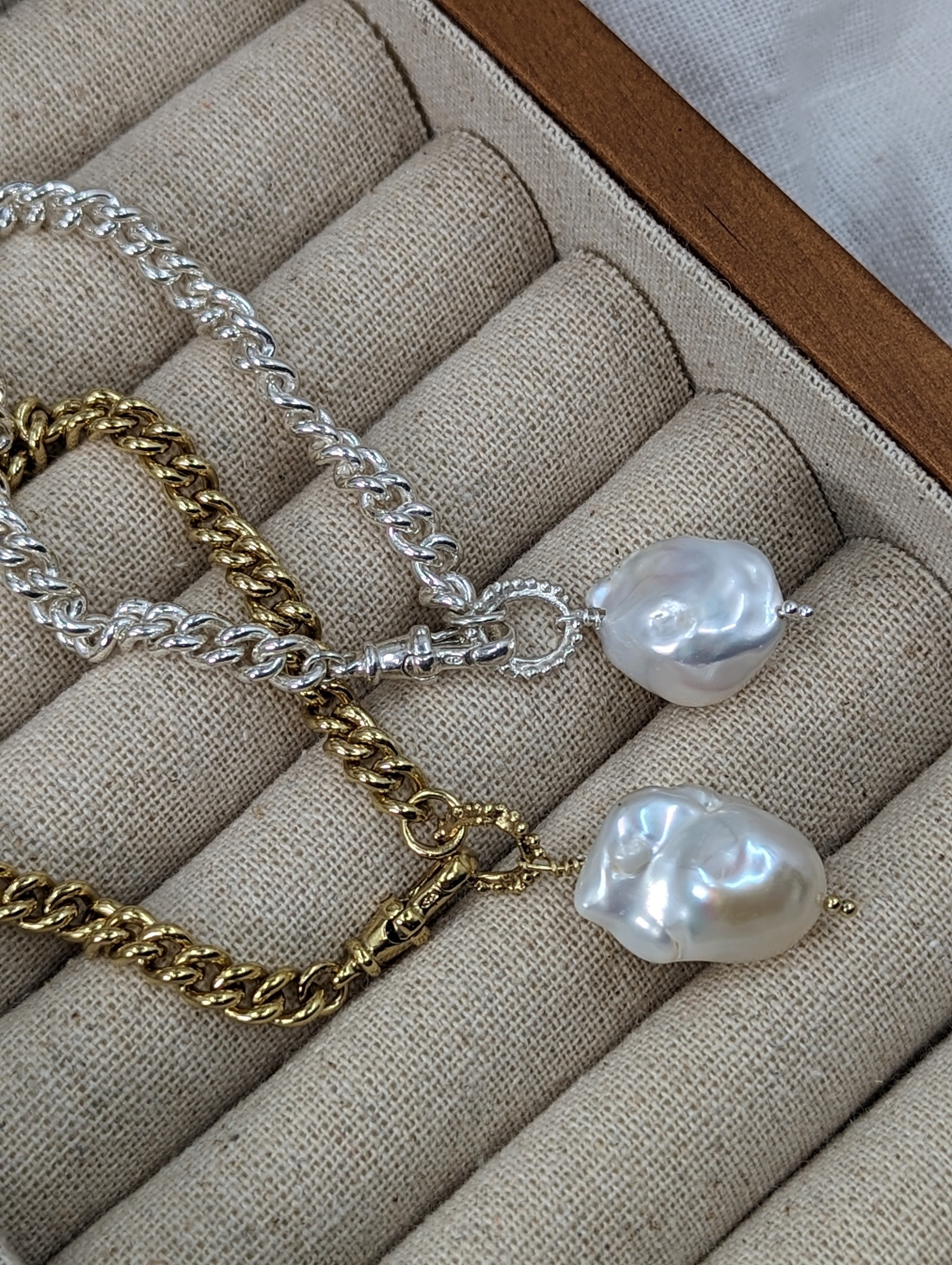A chunky statement chain bracelet with a large Freshwater Baroque pearl pendant delicately strung on a granulated mini halo. This sits beautifully on a thick curb chain with a lobster catch.