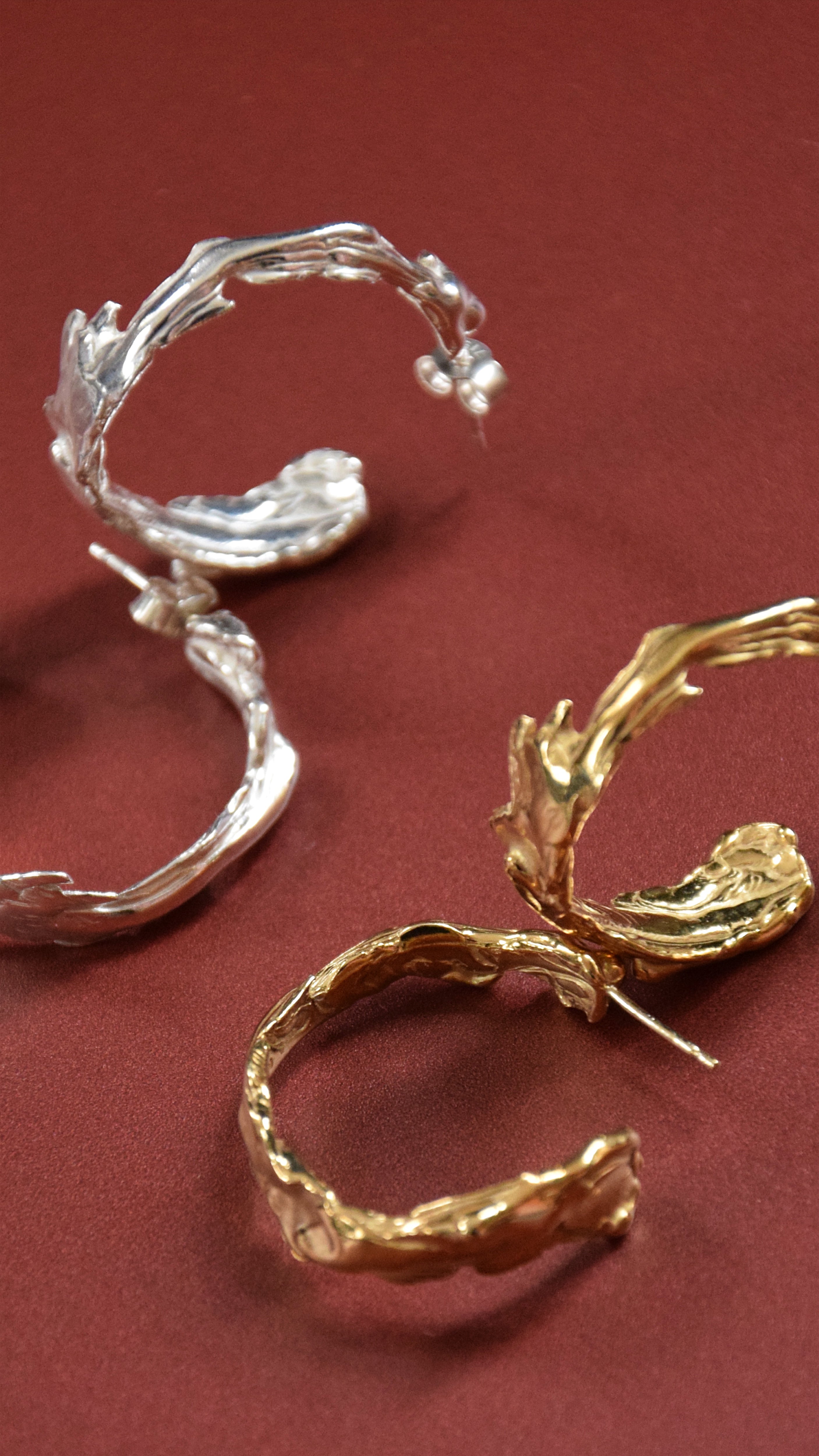 Statement earrings designed to look like molten metal. Handmade by casting molten liquid wax into shape, these are large enough to make an impact but not too heavy for your ears. The light dances off the surface in the most wonderful way.