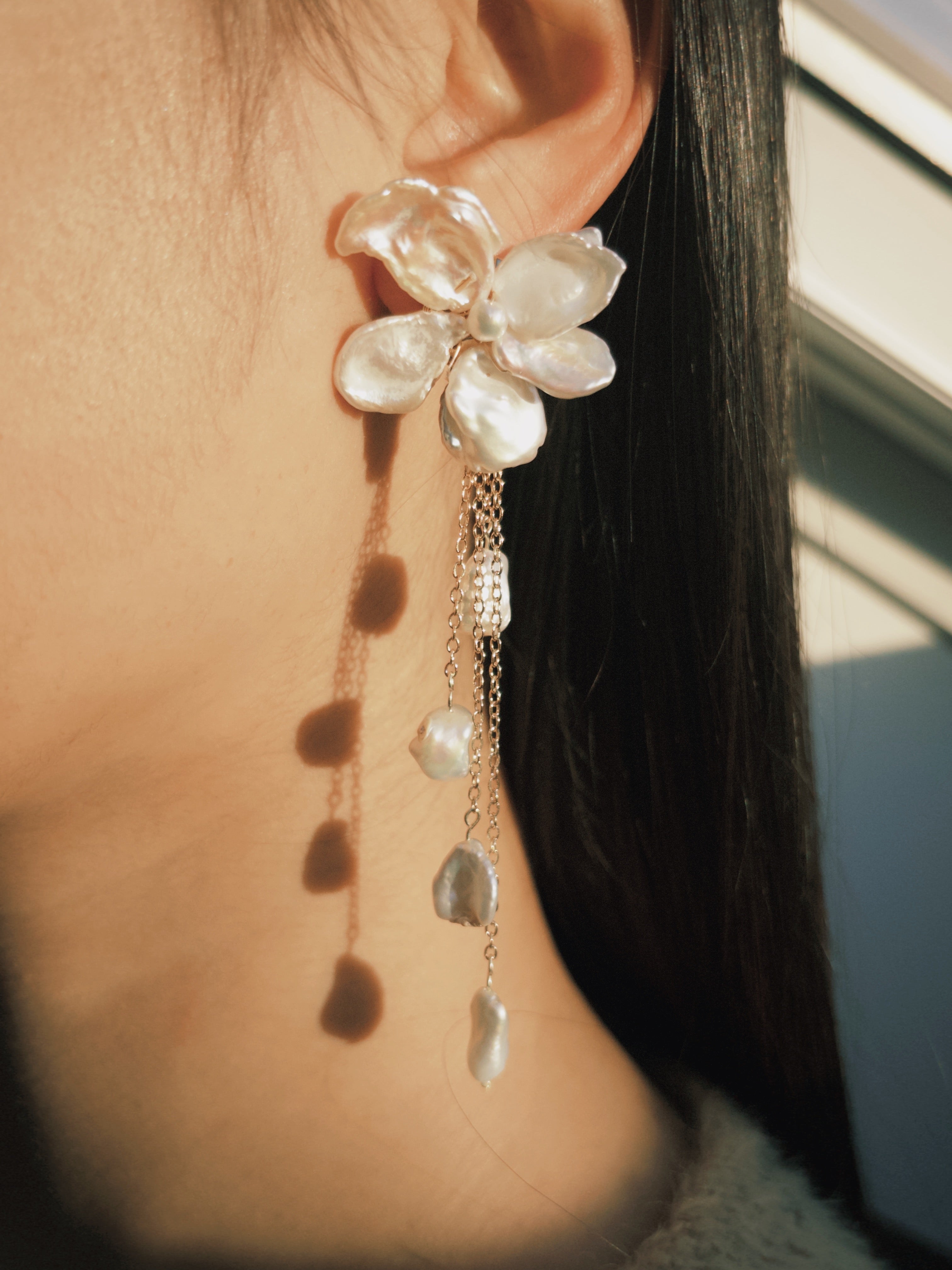 Each earring features radiant white keshi pearls with a luminous metallic sheen, artfully arranged in petal-like forms to resemble blooming celestial flowers. Their graceful dangle design enhances movement, catching and reflecting light with every turn, ensuring you’re the center of attention. Perfect for grand celebrations, formal events, or any occasion that calls for unforgettable style, these earrings add an undeniable touch of sophistication and charm.