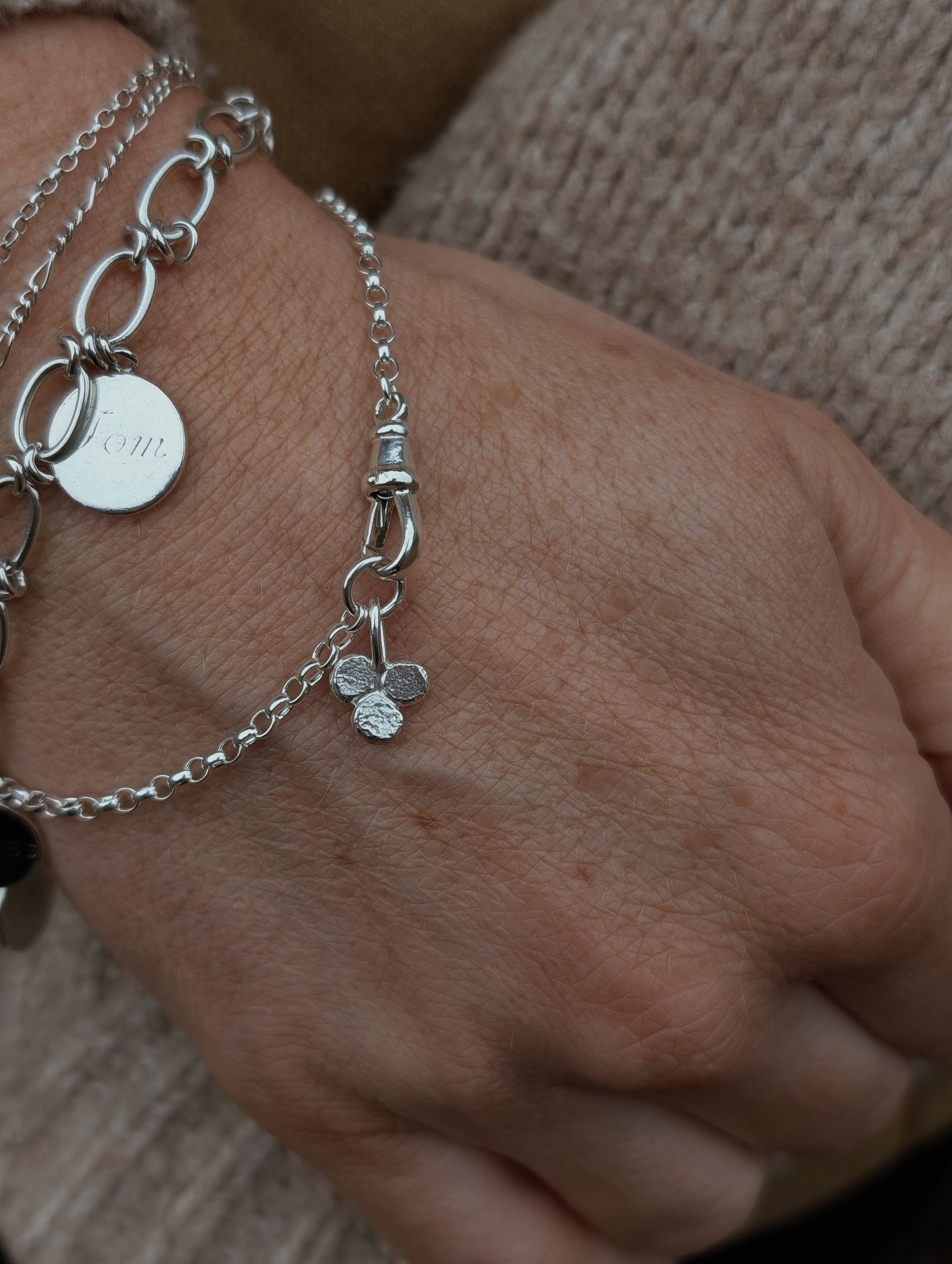 Milly-Maunder-Trio-Pebble-Clover-Charm-Pendant-Rustic-Chain-Bracelet-Stacking-Wrist-Stack-Sterling-Silver